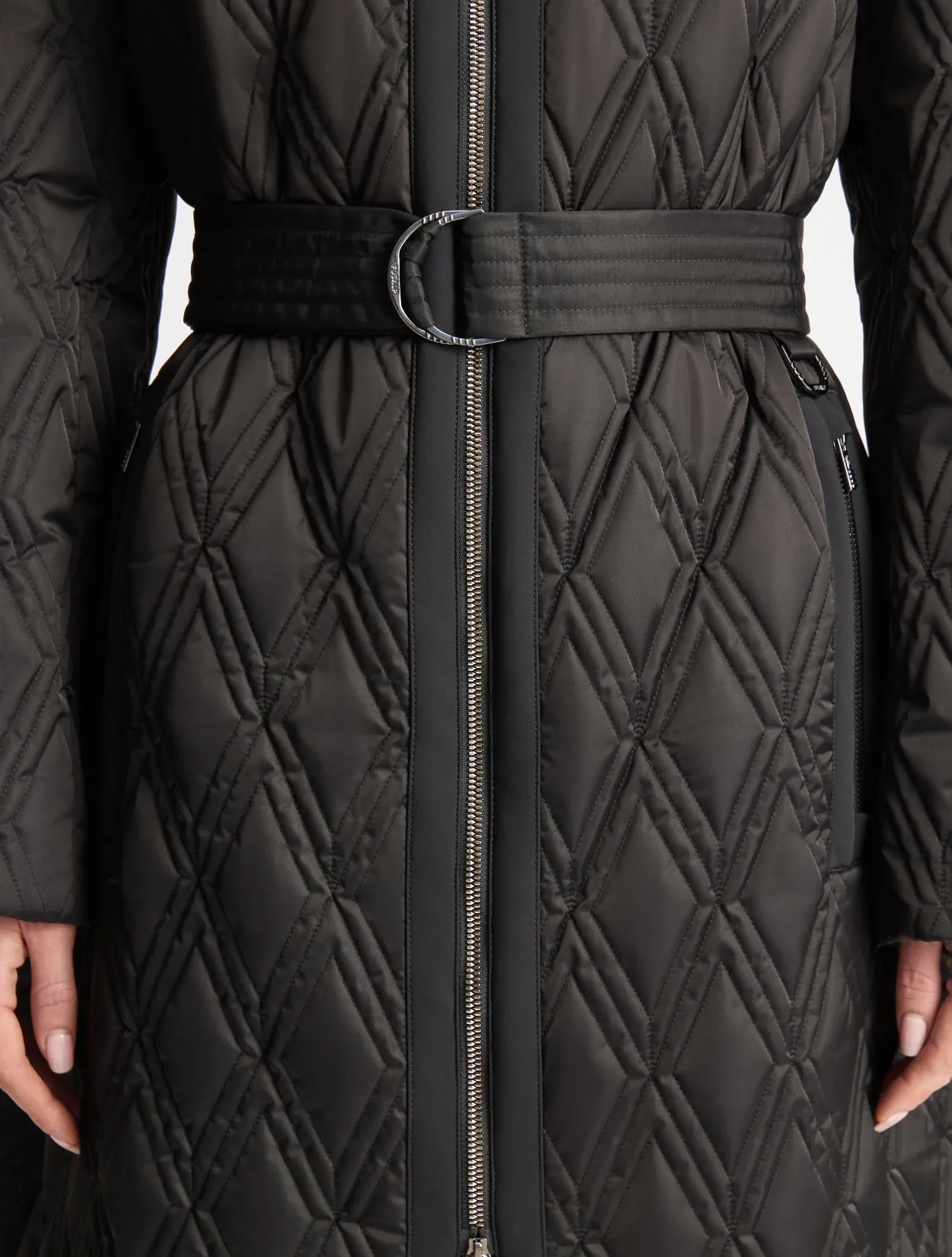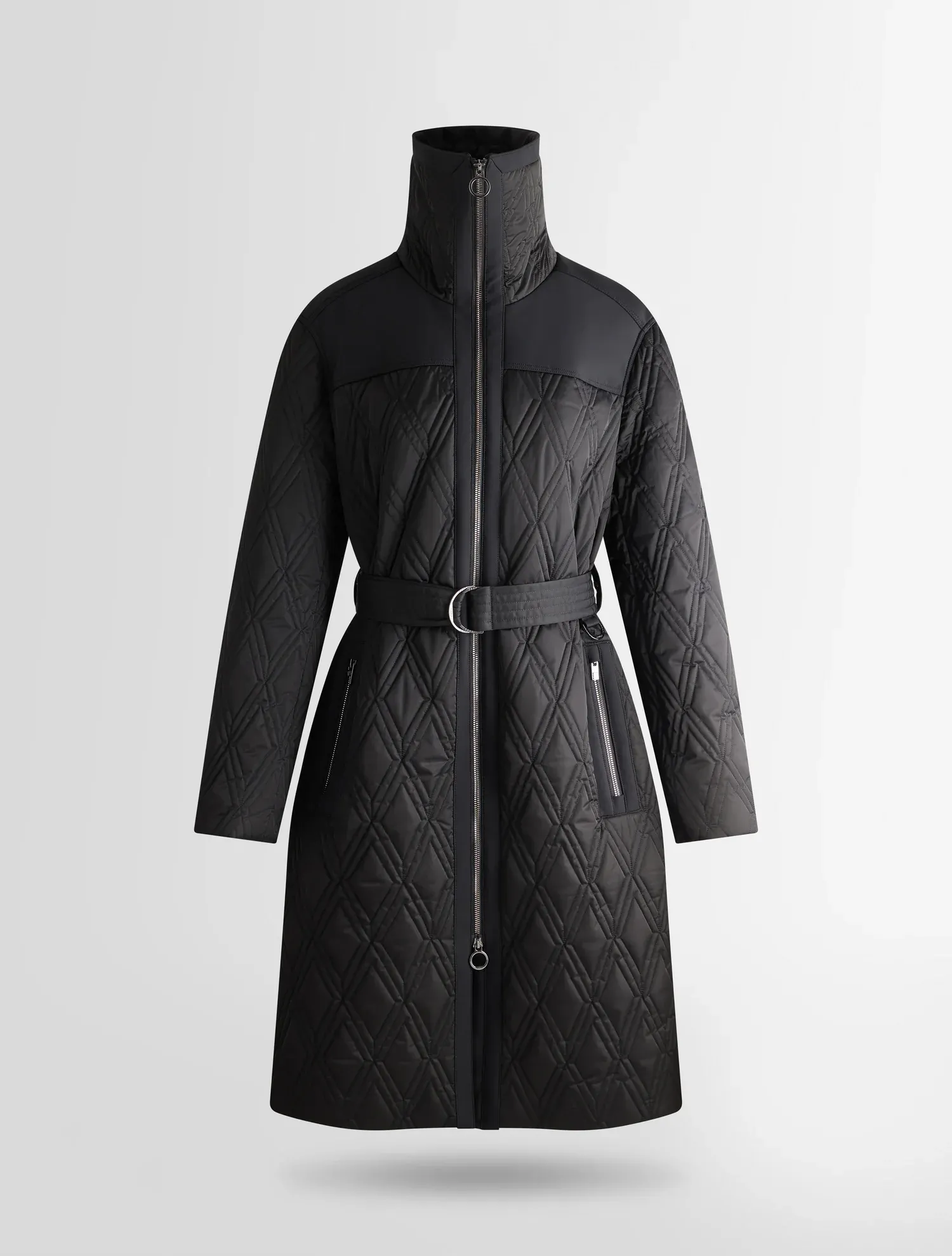 Le manteau Yseult incarne l’élégance sophistiquée de la Maison. Confectionné en toile et softshell déperlants, il affiche un matelassage en diamant, en écho aux codes de la Maison, pour une touche hautement iconique. Il se distingue par des détails de savoir-faire tailleur, tels que le col chemise, la coupe structurée, cintrée à la taille par une ceinture amovible, et une fente d’aisance au dos pour une liberté de mouvement optimale. Le manteau peut être assorti à une jupe ou un pantalon de la collection pour une allure raffinée et graphique.