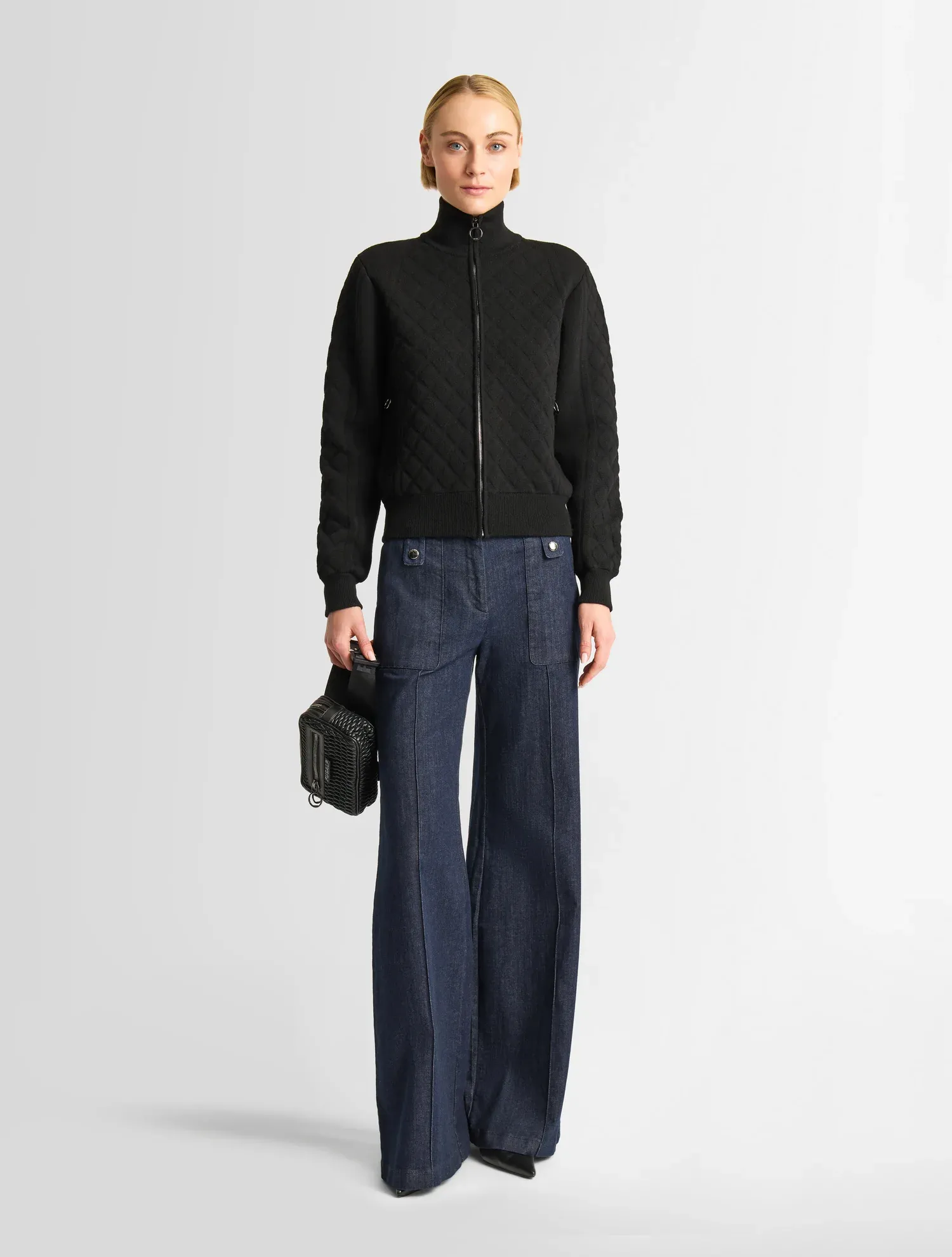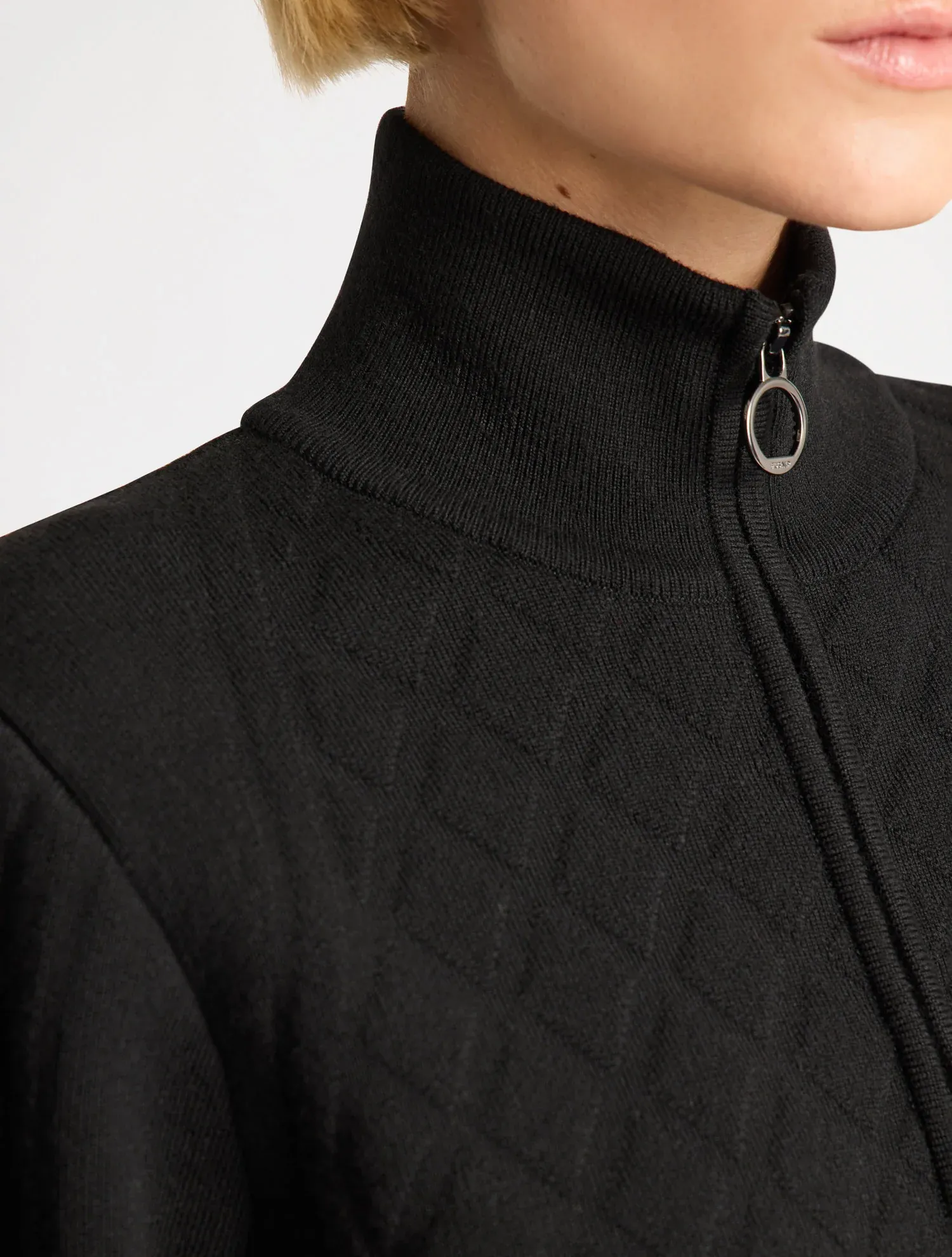 Le gilet Nuria séduit par sa silhouette graphique et élégante. Confectionné en laine mérinos, il met à l’honneur un empiècement en jacquard diamant, en écho aux codes de la Maison. Des détails tels que le col montant et l’ouverture avec zips brillants complètent ce modèle à l’allure chic et citadine.