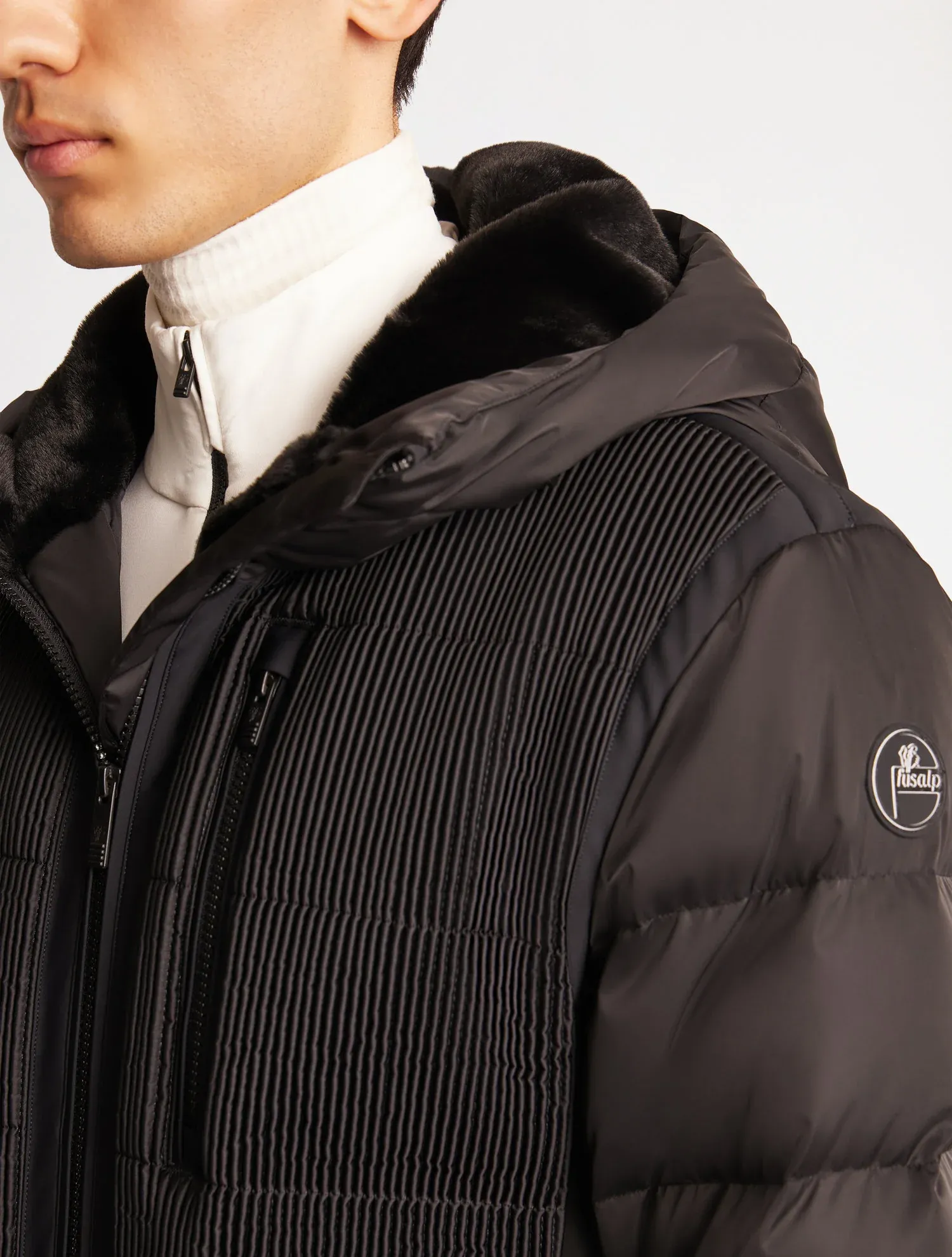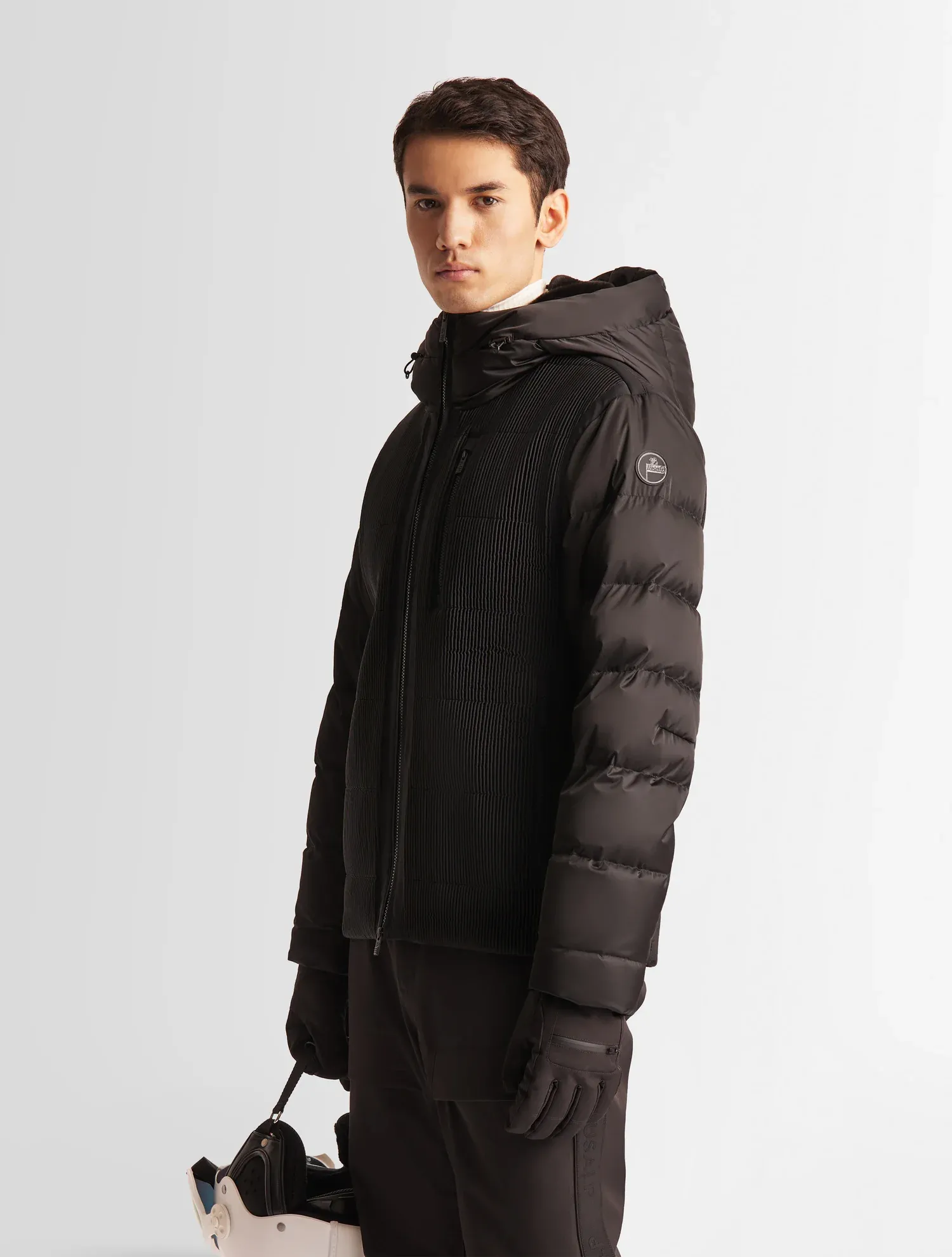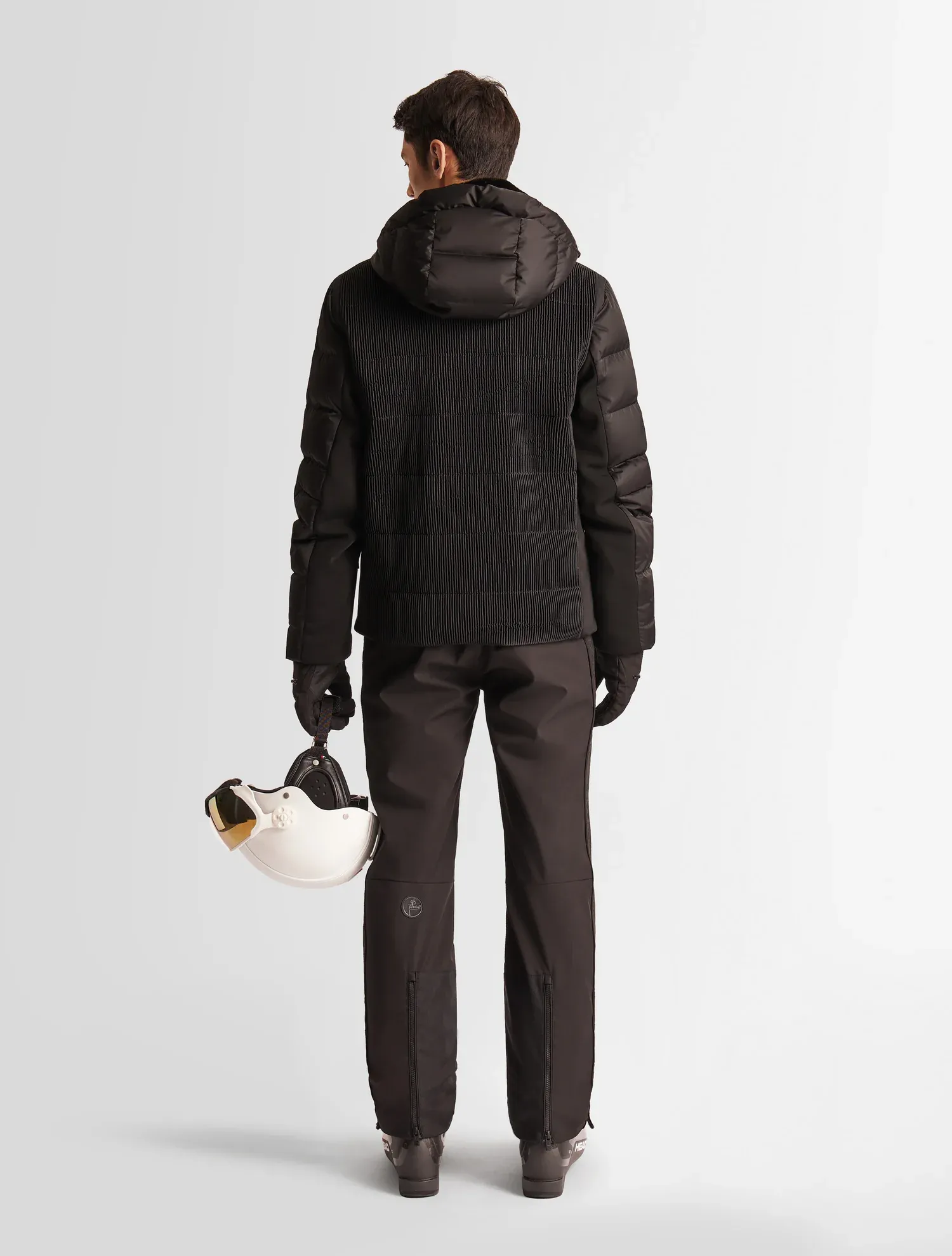 La veste de ski Aurele incarne l’esprit couture de la Maison grâce à son smock baguette iconique qui structure la silhouette, tandis que ses panneaux latéraux en softshell stretch lui assurent une belle amplitude de mouvement. Des détails luxueux tels que la capuche enveloppante doublée de fausse fourrure ou ses manchons en tricot en font un modèle emblématique du vestiaire de ski masculin. Cette création est pourvue de tous les attributs essentiels du ski et s’accordera parfaitement avec un des fuseaux de la collection pour une allure élégante sur les pistes.