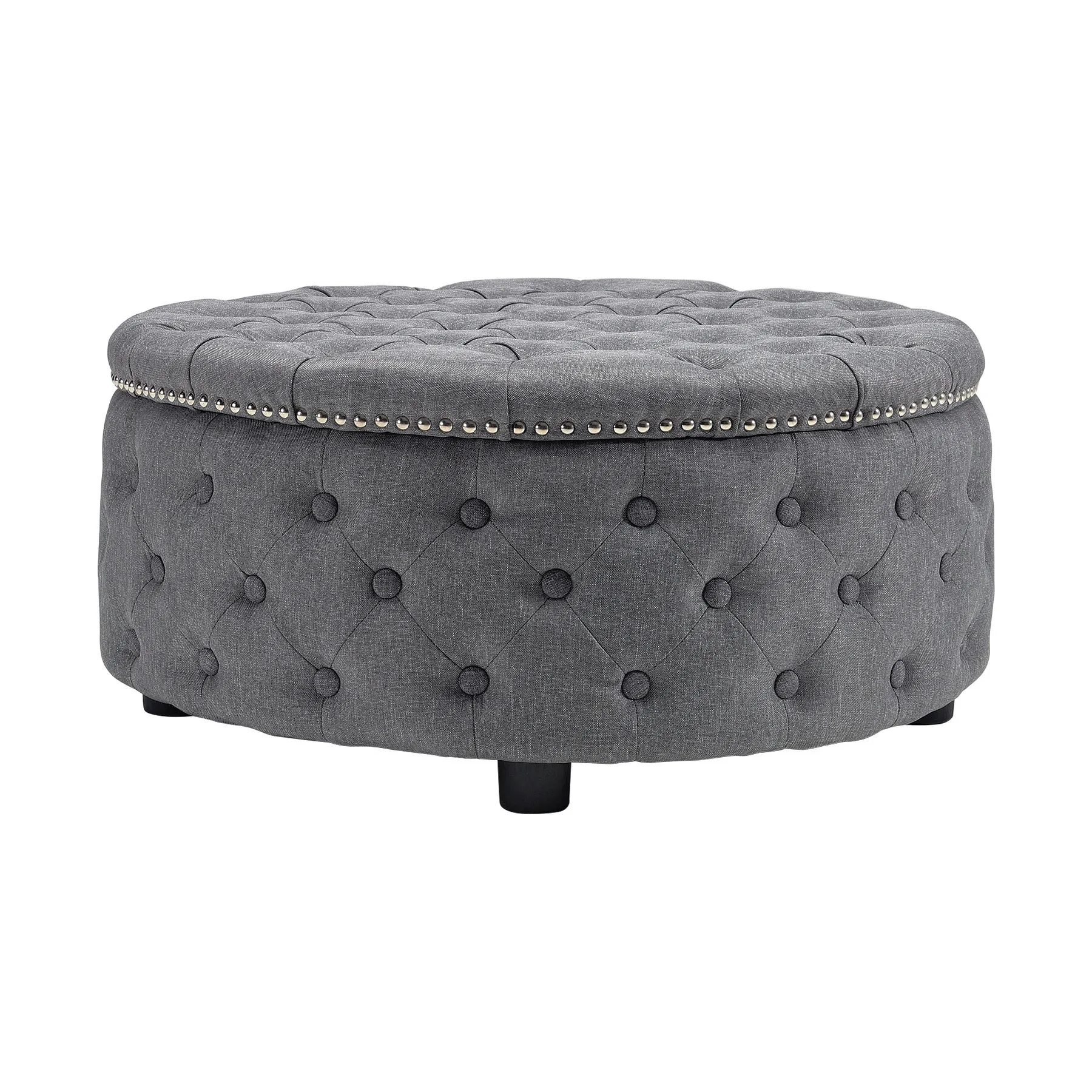 Round Linen Deep Buttoned Ottoman with Studded Edge Footstool
